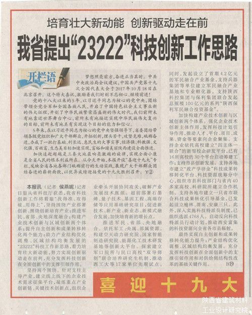 編者按:9月2日《陜西日?qǐng)?bào)》頭版開(kāi)辟“喜迎十九大”專欄,反映全省各地各部門砥礪前行的生動(dòng)實(shí)踐,展現(xiàn)廣大干部群眾團(tuán)結(jié)奮進(jìn)的嶄新面貌,以優(yōu)異成績(jī)迎接黨的十九大勝利召開(kāi)。開(kāi)篇刊發(fā)《培育壯大新動(dòng)能 創(chuàng)新驅(qū)動(dòng)走在前 我省提出“23222”科技創(chuàng)新工作思路》文章,請(qǐng)閱讀!