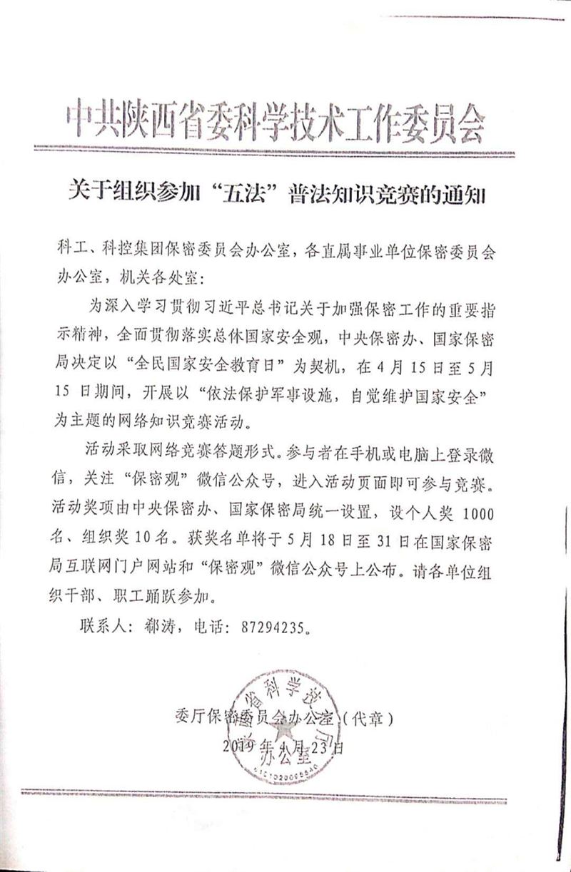 按照陜西省委科技工委《關(guān)于組織參加“五法”普法知識競賽的通知》要求和集團工作安排,陜西省委科技工委計劃于4月15日至5月15日期間開展以“依法保護軍事設(shè)施,自覺維護國家安全”為主題的網(wǎng)絡(luò)知識競賽活動。請各部門通訊員認真組織部門人員積極參加網(wǎng)絡(luò)競賽答題,并于5月16日將本部門參加答題情況匯總上報至院辦公室。