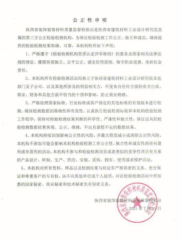 陜西省裝飾裝修材料質量監(jiān)督檢驗站公正性申明