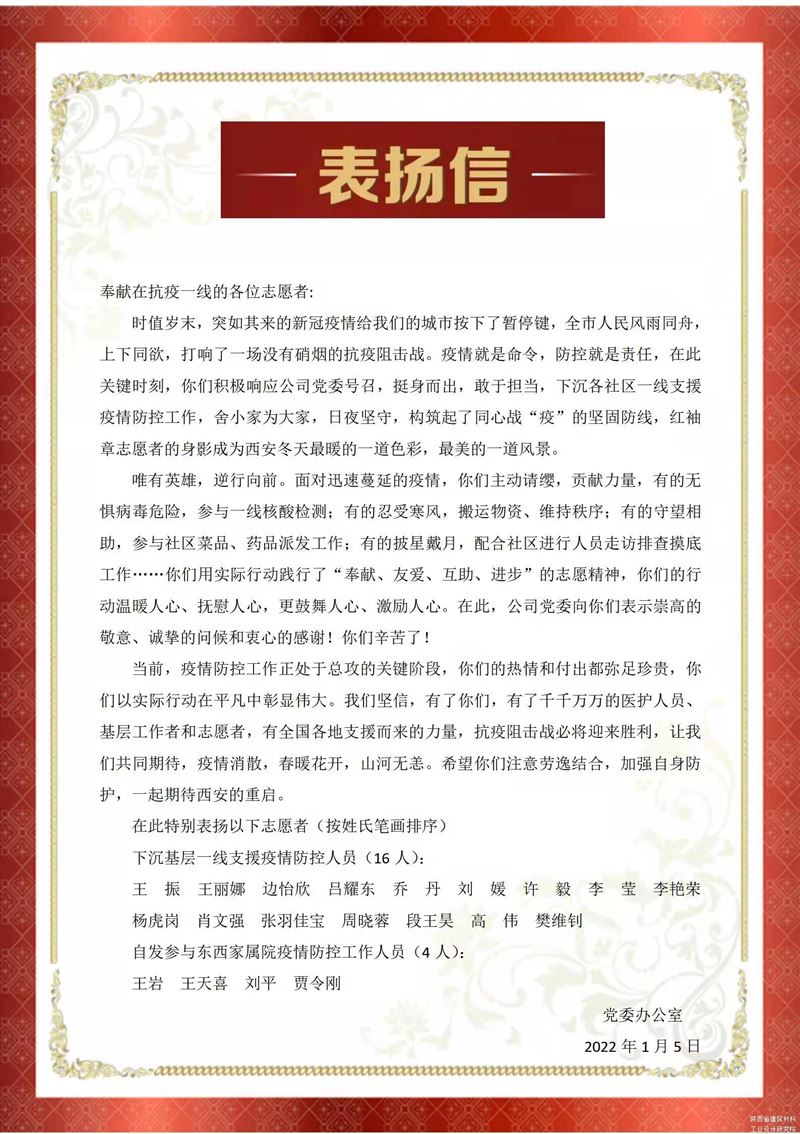 建材院黨委對一線抗疫志愿者的表揚信