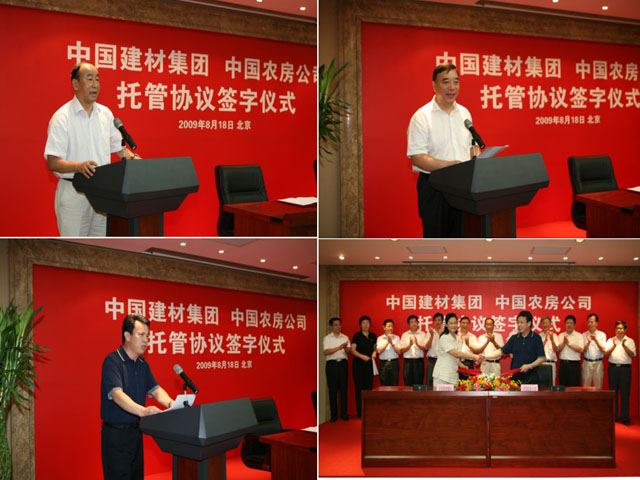 8月18日,中國建材集團(tuán)與中國農(nóng)房公司在北京簽署托管協(xié)議,中國建材集團(tuán)按照國資委要求正式托管中國農(nóng)房公司。國資委黨委委員李壽生出席協(xié)議簽署儀式并作重要講話。中國建材集團(tuán)董事長、黨委書記宋志平,中國農(nóng)房公司總經(jīng)理張子山分別致辭。中國建材集團(tuán)總經(jīng)理、黨委副書記姚燕和中國農(nóng)房公司總經(jīng)理張子山代表雙方簽字。儀式由國資委機(jī)關(guān)服務(wù)管理局局長劉茂勛主持。